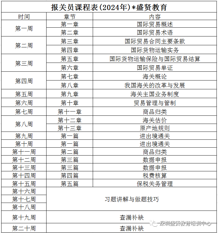 报关概述、对外贸易、对外贸易管理、对外贸易单证、海关管理、海关制度、税费种类及计算、报关单各项分解、报关单填制及纠错、保税加工报备核算、商品编码、进出境报关、报关及报关管理复习、总复习。
